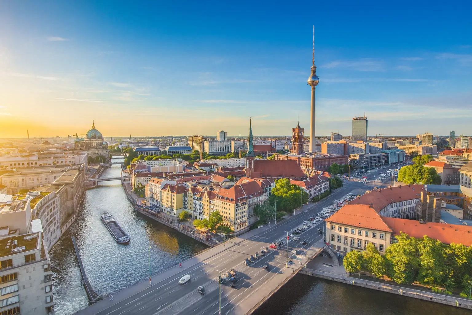Πανοραμική θέα του Βερολίνου με τον Πύργο της Τηλεόρασης και τον Καθεδρικό Ναό, στο ηλιοβασίλεμα πάνω από τον ποταμό Σπρέε.